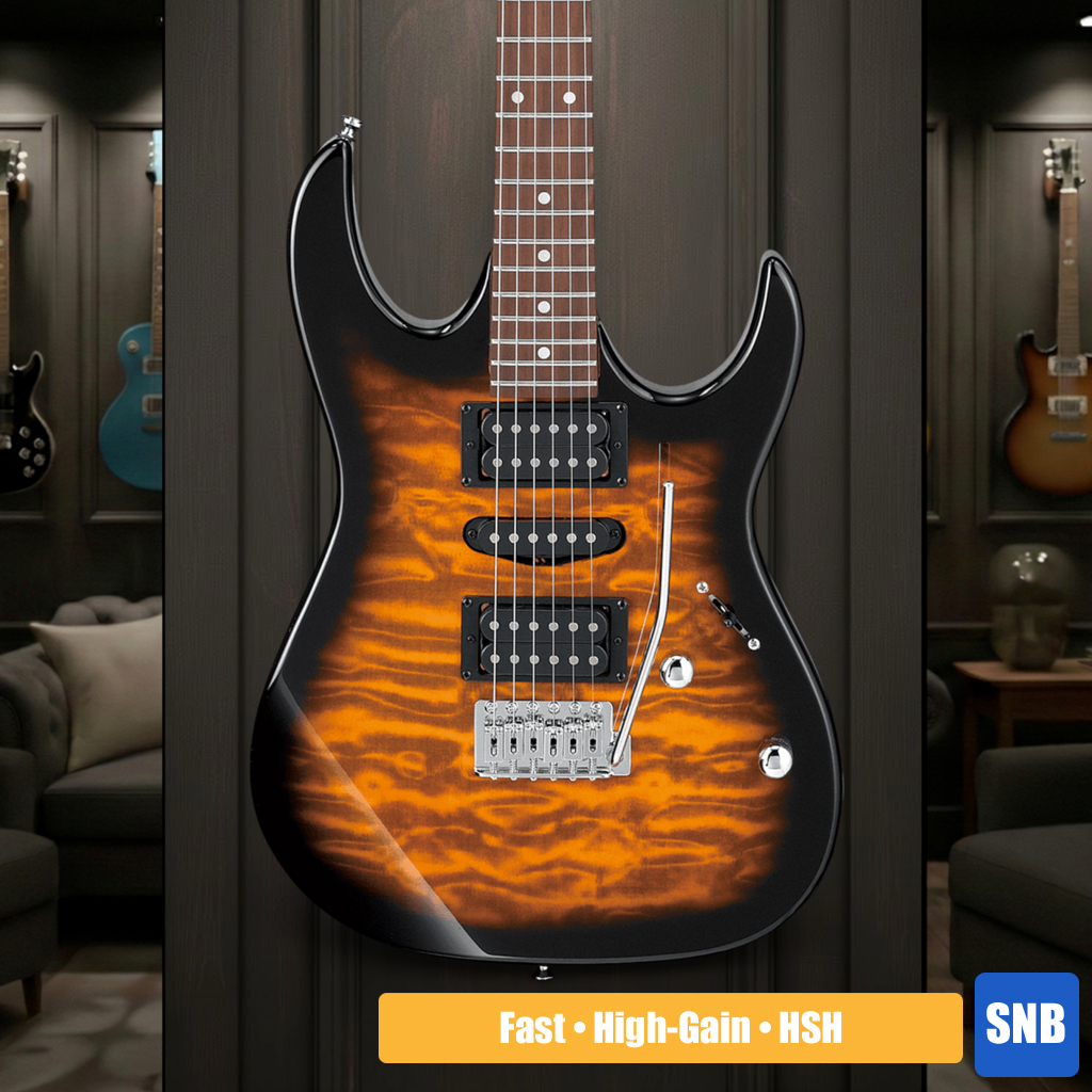 A guitar is only as playable as its neck — good thing the Ibanez GRX70QA has a smooth and fast-playing maple neck. This comfortable neck is capped by a bound jatoba fingerboard with a super-flat 15.7" radius and 22 medium frets, giving you the agility to execute fast single-note runs with ease.