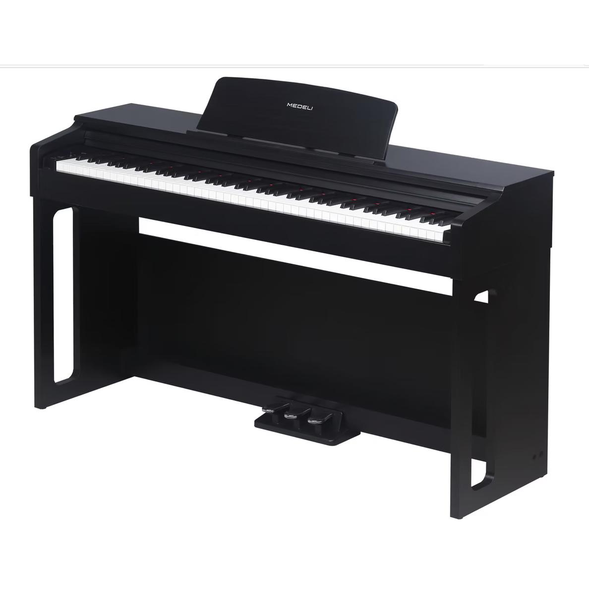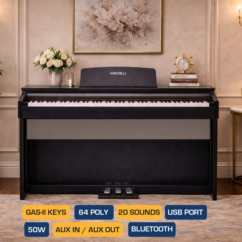 The Medeli UP105 is a stylish Bluetooth-enabled digital piano designed for players who want the warmth of an acoustic upright with the convenience of modern technology. Its graded hammer-action keys deliver a natural and expressive playing feel, while the high-quality stereo sound engine offers rich piano tones suitable for beginners, students, and home performers.rnWith built-in Bluetooth Audio/MIDI, you can stream music, connect to learning apps, record, and practice wirelessly. The UP105 also features a sleek cabinet with sliding key cover, a powerful speaker system, dual headphone outputs for silent practice, and essential functions such as metronome, layering, split mode, and recording.rnrnA perfect choice for home, school, and studio use—beautiful design, reliable performance, and all the modern features you expect from Medeli.