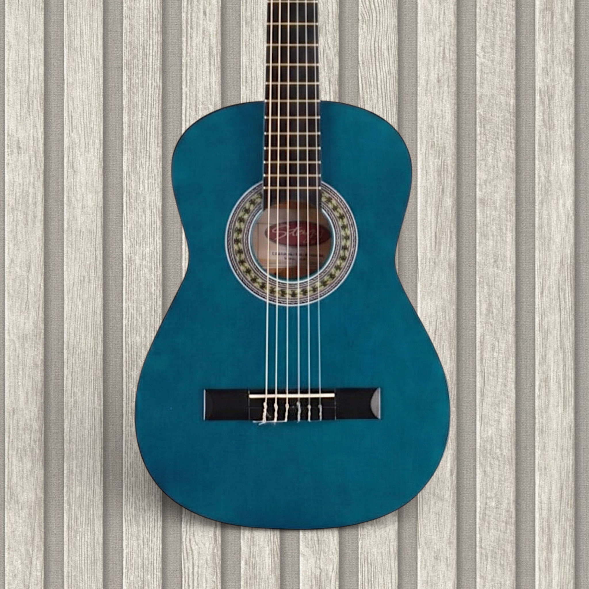 The Stagg C405 (1/4) is a child-sized classical guitar designed for young learners. It features a linden wood top, with matching linden back and sides, giving balanced, warm tone characteristics at this scale. The fingerboard and bridge are made of composite walnut, offering durability and stability. Classical-style nickel tuning machines are provided to help maintain tuning integrity, and the finish is matte to reduce visible wear. Its small size makes it comfortable for children to grip and play, while still delivering the warm timbre of a classical instrument. According to listings, the model is also offered in various finishes including natural and blue