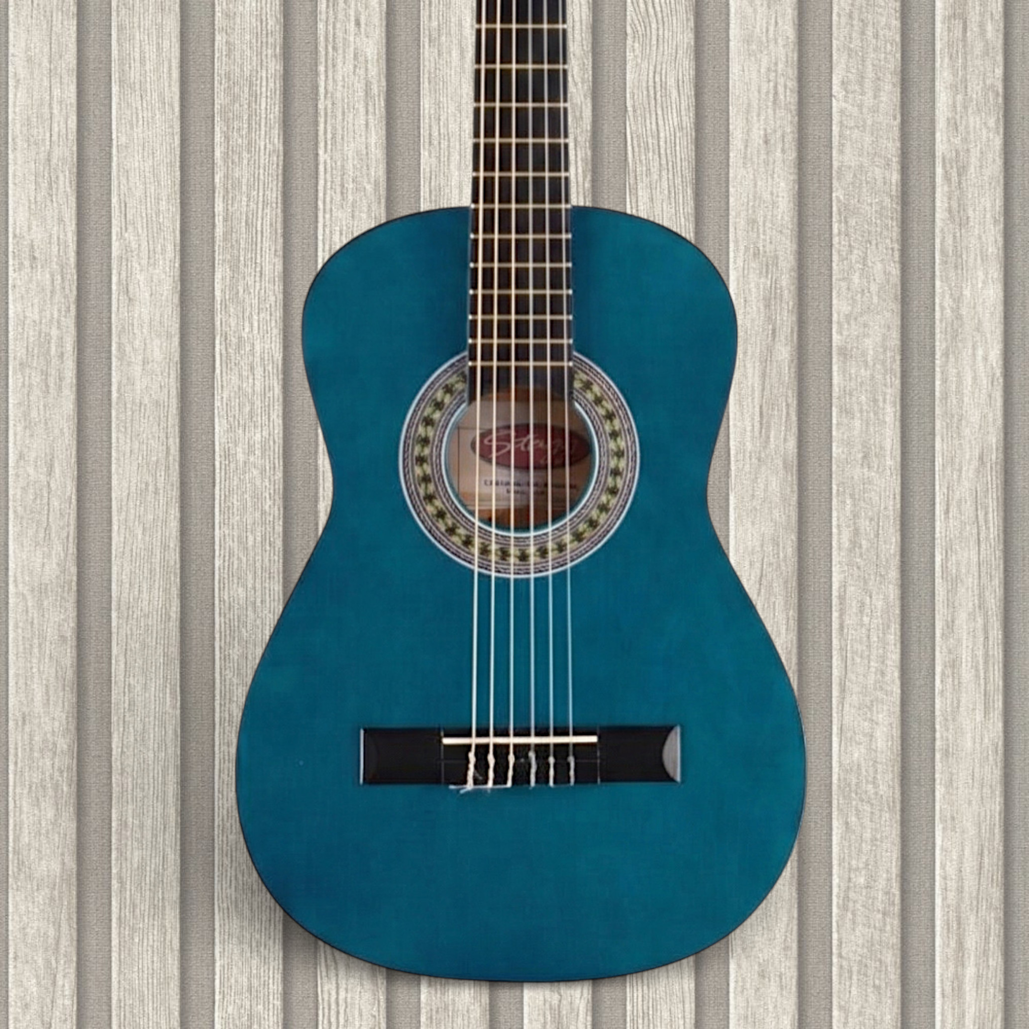 The Stagg C410 ½ M Blue is a child-sized classical guitar crafted to provide a balanced, warm tone suitable for beginners. It features a linden top, back, and sides, giving it a mellow, resonant voice. The neck is made of Nato and is equipped with a truss rod for added stability and adjustment. The fingerboard and bridge are constructed from composite walnut, combining durability and smooth playability. The width at the nut is 42 mm, and the scale length is 558 mm (21.96″), making it a manageable size for small hands. Classical nickel tuning machines ensure traditional tuning reliability, and the finish is matte to reduce glare and visible scratches.