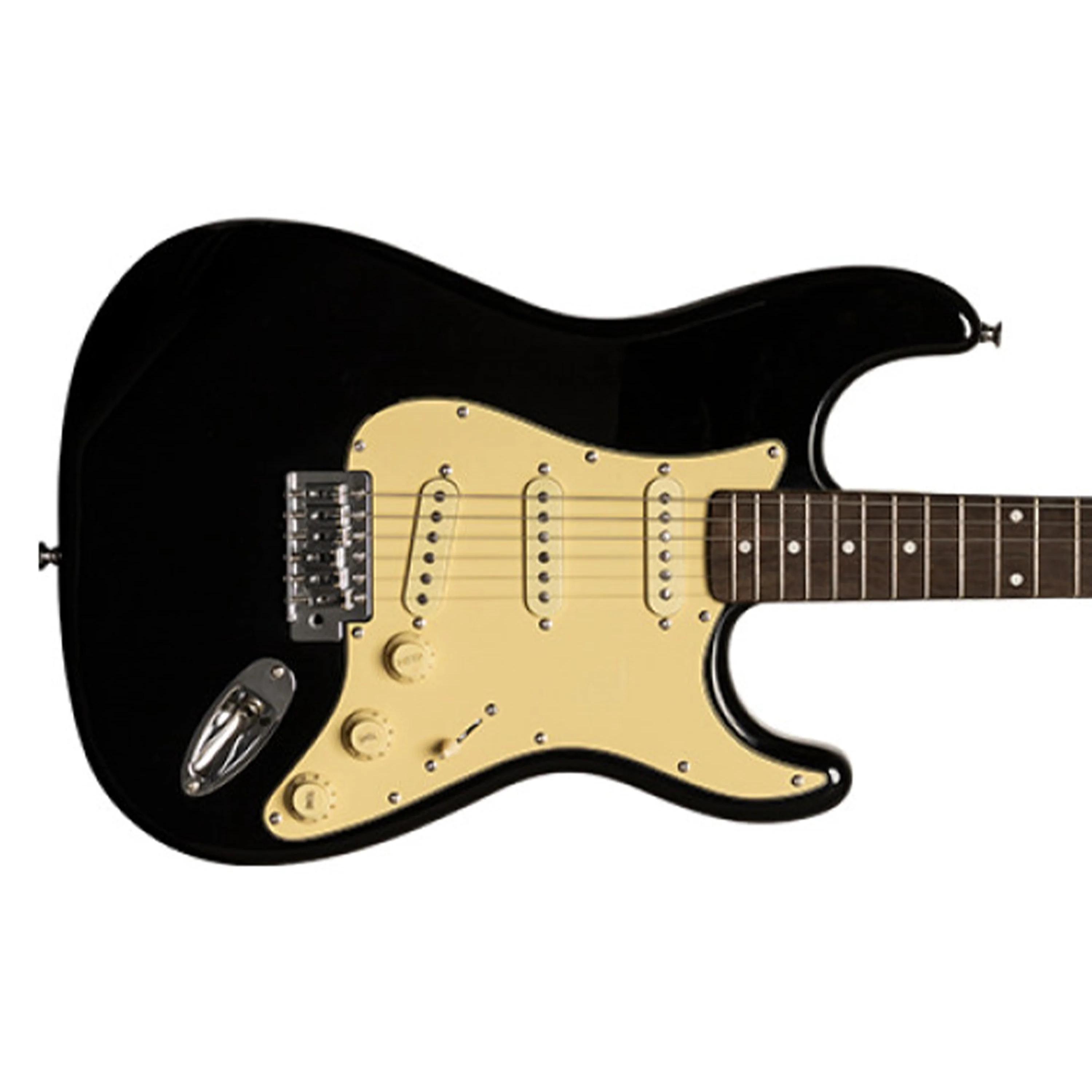 The Stagg SES-30 BK combines iconic design with dependable craftsmanship, making it an excellent choice for players stepping into the world of electric guitars. Built with a solid paulownia body and a bolt-on maple neck, it offers a lightweight yet resonant feel. The rosewood fingerboard with 21 frets ensures easy movement and comfortable fingering. Equipped with three single-coil pickups, a 5-way selector switch, and dedicated volume and tone controls, this guitar delivers a wide range of bright and versatile tones suitable for blues, pop, rock, and funk styles. The tremolo bridge provides expressive pitch control, while die-cast tuners ensure stable tuning. Finished in elegant high-gloss black, the SES-30 stands out for its modern look and reliable performance.